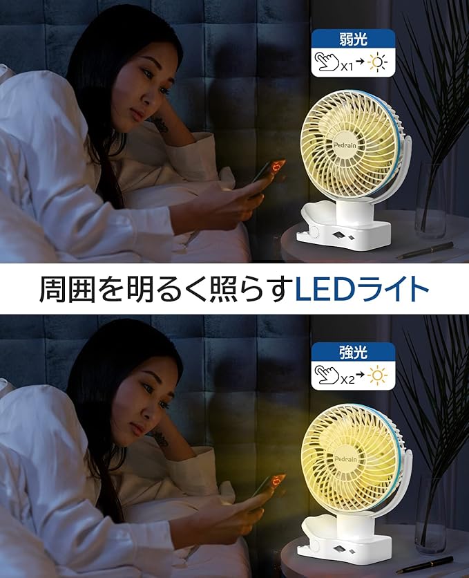 【リモコン付き・タイマー機能・LEDライト】リモコン付きで超便利!全ての操作をリモコンでも行えますので、離れた場所から遠隔操作ができます。電源ON/OFF、自動首振り、風量モート切替り、タイマー機能0.5h/1h/1.5h/2h、LEDライト切替りなどリモコン操作ができるので、お部屋でくつろいいだまま快適に過ごせます。弱・強の2段階で明るさが調整できるナイトライト機能付きで、明かりは柔らかくて目を保護します。アウトドアや地震、台風の停電時も困らず、安心感いっぱい!