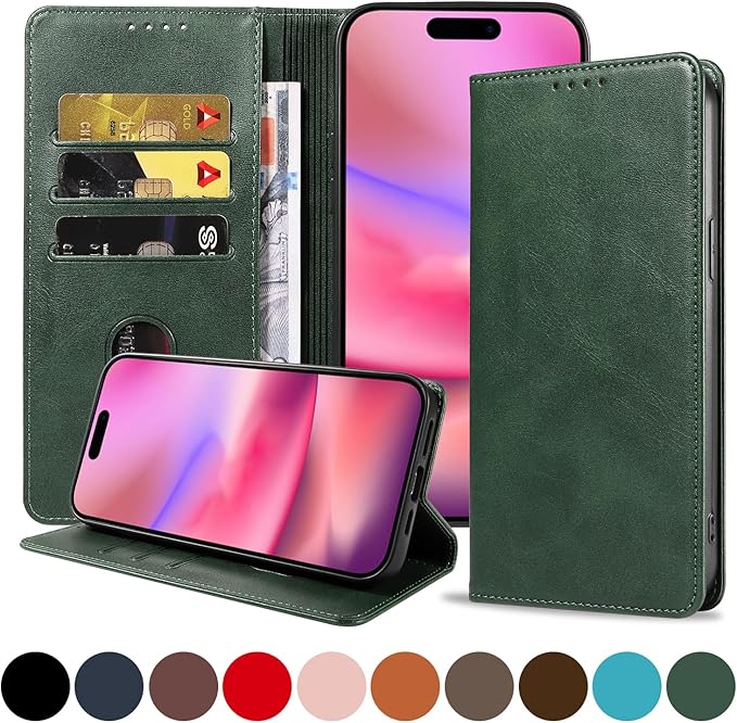 iPhone 16 ケース アイフォン16 スマホケース 手帳型 携帯カバー レザー 耐衝撃 軽量 着脱しやすい 放熱性 マグネット式 カード収納 スタンド機能ケース16 対応 360度保護 PinLiSheng (グリーン, iPhone 16)