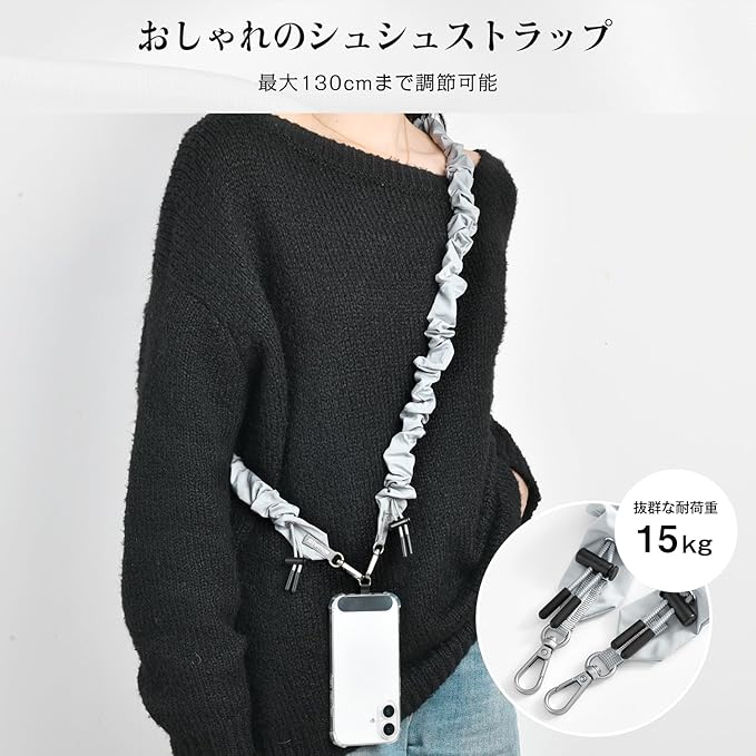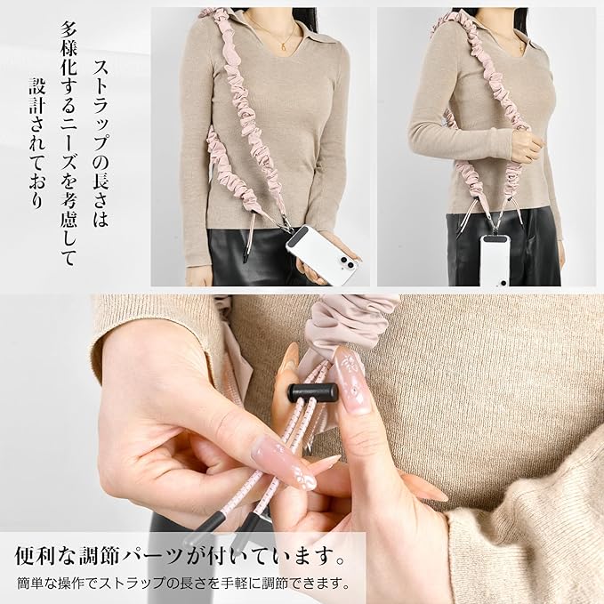 【長さ調節可能なショルダーストラップ】紐とコードストッパーで長さを調節できます。 長さは最大130cmなので、自分に合う長さでお使いいただけます。コードストッパーで調節した長さをしっかり固定できます。
