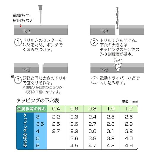 薄鋼板を留め付ける場合下穴が必要です。下穴の目安は画像の「タッピング下穴目安表」をご覧下さい。