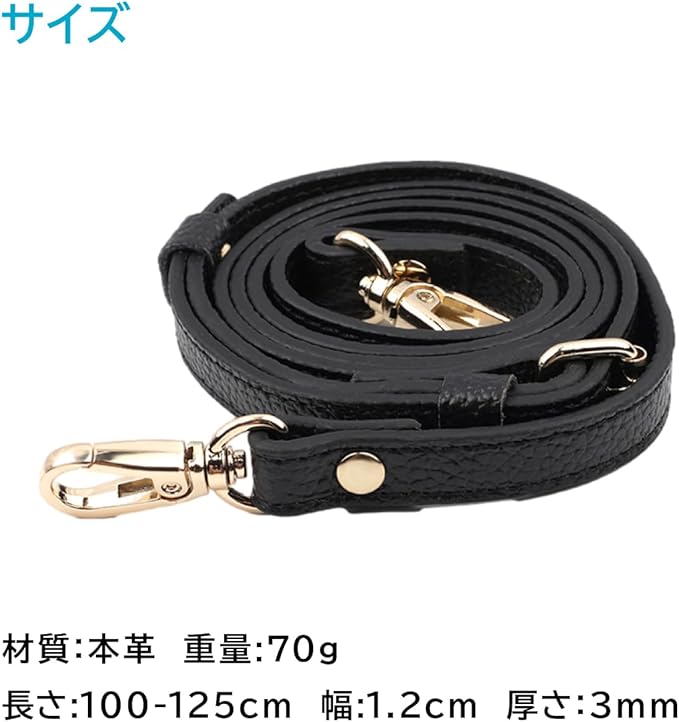 【仕様】サイズ:〈長さ〉100cm~125cm〈幅〉1.2cm〈厚さ〉3mm / 重量:70g / 材質:本革 / カラー:ブラック  ※モニターの環境により、色の見え方に若干差が生じる場合がございます。