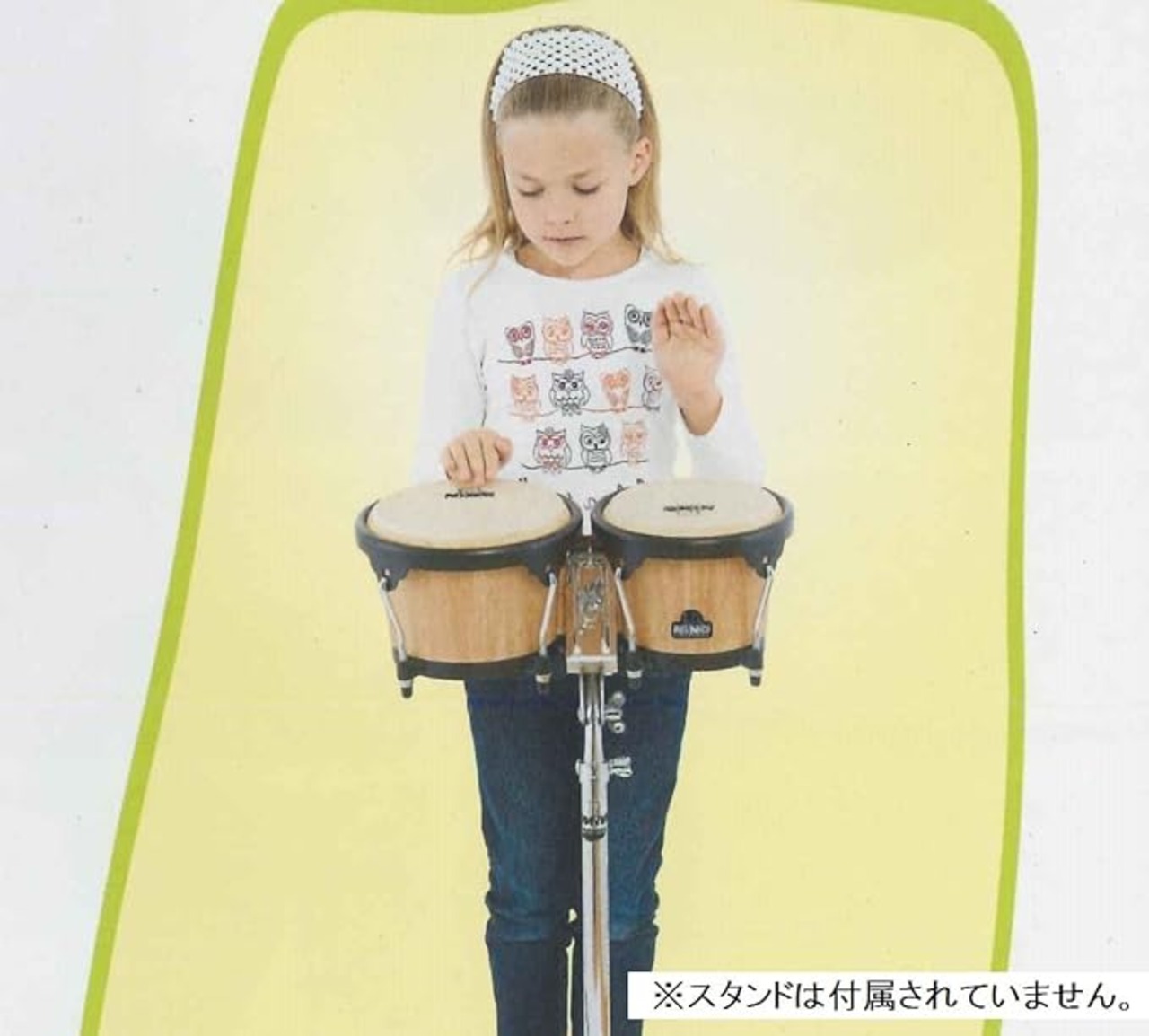 本格的な木製ボンゴ! 【NINO3NT-BK】ラテン音楽、ポップス、吹奏楽などで活躍するキューバの民族楽器ボンゴ。本商品は6.5インチと7.5インチの2つの太鼓が対になったものです。左右で音程が異なる太鼓を組み合わせ、思い浮かぶリズムを自由に叩いて楽しんでください! ボンゴは奏法次第で音色の変化を楽しめます。手を使って素朴な音色を響かせたり、ここ1番の見せ場ではスティックを使ってキレのあるしびれる音を演奏したりして、音楽にメリハリを利かせましょう! 通常のボンゴは椅子に座り足で挟んで演奏しますが、本商品は足付なので机や膝の上に置いた状態での演奏も可能です。ゴム製の足なので叩いている最中にボンゴが滑る心配がありません。別売のボンゴスタンド(SBS-100)を使えば立って演奏も楽しめますよ! 材質:ラバーウッド本体、水牛革ヘッド寸法:φ16.3(φ6.5″) 17.5cm+φ18.8(φ7.5″) 17.5cm重量:3.5kg付属品:チューニングキー備考:ボンゴスタンドSBS-100取付可能