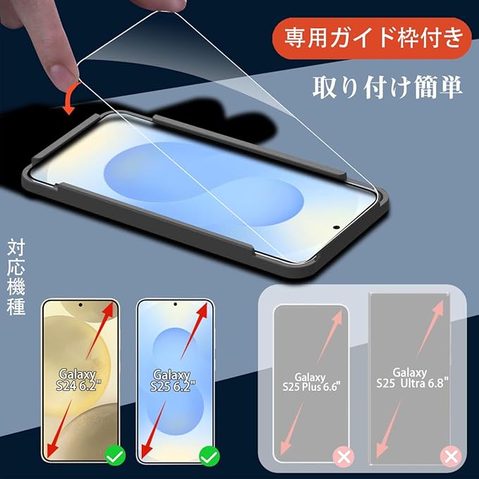 【対応機種】 Galaxy S25 / S24 専用 ガラスフィルム (2枚入り)【製品保証の概要】:製品に不具合が生じた場合は、お客様からのお問い合わせ内容に応じて代替品交換・返金対応を提供致します。(お一人様につき1回限り)