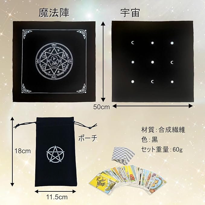 【商品仕様】商品内容:タロットクロス1枚、タロットバッグ1個。カラー:ブラック。サイズ:タロットクロス50cm 50cm。タロットバッグ長さ18cm、幅11.5cm。合計重量:60g。モニターなど環境により画像と若干見え方が違う場合がございます。