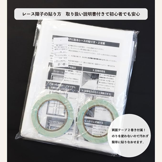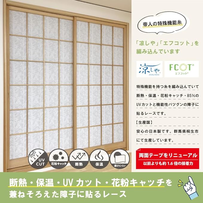 帝人の機能糸「涼しや」&「エフコット」を編み込んだ光と風を通す多機能なレース障子です。夏は遮熱効果、冬は保温効果があります。また花粉キャッチ機能で外から室内への花粉やホコリの進入を抑えます。レース生地ですので、通気性や採光性に優れており、破れにくい素材なので障子紙に比べると長持ちします。取付方法は、桟のサイズに合わせて、カットしてお使いください。詳細な取扱説明書(レース障子の貼り方)が付いていますので、作業が不慣れな初心者の方でも安心。紙と違って破れないので、ゆがんだりたるんだりしたら貼り直しが出来ます。細幅の両面テープが2巻付いてます。水のり等を使わないので準備も簡単で汚れません。 ※障子レース生地を貼る際、生地の表と裏を間違わない様にしてください。(※光沢がある面が屋外側になります。)梱包状態のたたみシワが気になる場合はアイロンを掛けてから貼ってください。