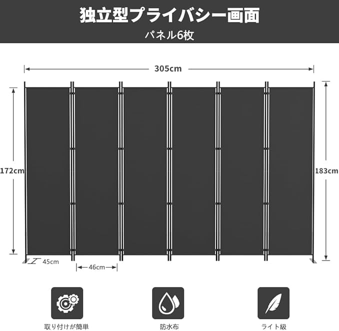 柔軟な折りたたみと多用途: この布タイプ 屏風目隠しーには 6 枚の軽量パネルが付属しており、それぞれの寸法は 46cm x 183cm、合計サイズは 305cm x 183cm です。パネルは柔軟なコネクターで接続されているため、折りたたむことでさまざまな構造を作成できます。リビングルーム、ベッドルーム、事務所、オフィス、更衣室、会議室、寮など、どこにいても自分だけの空間が生まれます。