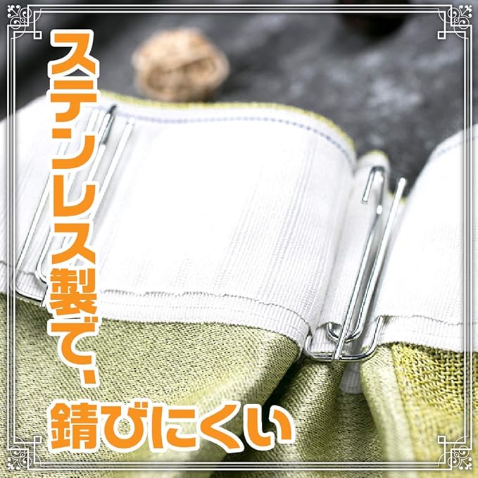 ・カーテンテープを使用するなら、カーテンにひだを作る必要なく、間隔を自由に調節しながらフックを取り付けることが可能。初心者さんでも、簡単にカーテンを作成することができます。(テープは、カーテン部分に直線縫いにて、縫い付けることができます)