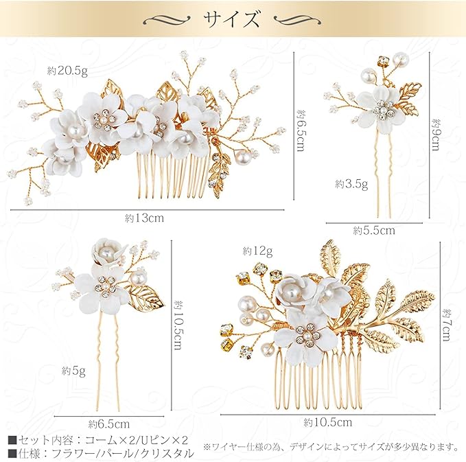 ゴールドをベースにフラワー・パール・ストーンデザインのヘッドドレス(コーム&Uピン 4種セット)です。