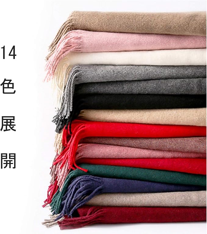 デザインのメリット:1.暗いブラックから明るいピンクまで多色展開で、通学の学生から通勤のサラリーマンまで相応しい。クリスマスプレゼントとしてもよい選択。2.サイズがおおきいなので、膝掛けやストールやショールやパシュミナとしても使える。3.シンプルな無地のデザインで、スタイルによらず合わせやすい。この秋冬マフラーは秋冬マストと言える。