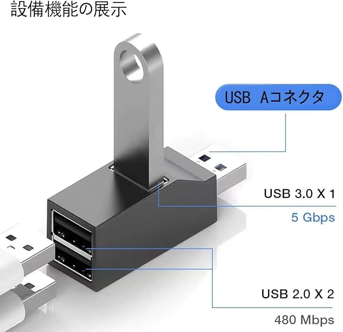 【3ポート拡張,最高伝送速度】: USB 3.0ポートx 1、USB 2.0ポートx 2。ノートパソコンまたはデスクトップパソコンで最大1つのUSB-Aポートを使用して3つのポートに接続できます。ケーブルを介さずにスタイリッシュに使えるノートパソコン用3ポートUSBハブ。【最高伝送速度】:USB 3.0高速/5 Gbps(理論値)、USB 2.0高速/480 Mbps(理論値)。
