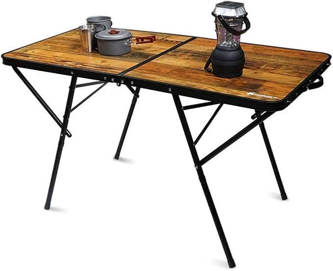 ★こちらはおしゃれなヴィンテージリアルウッド柄が目をひく柄でシックなブラックフレームを採用した2~4人用のアウトドアテーブルです。高さ68cmのハイスタイル・37cmのロースタイルの2way仕様なので、シーンに合わせて使い分けが可能。また、様々な方向から足を入れて着席できる脚の構造デザインもメリットで他にないタイプです。