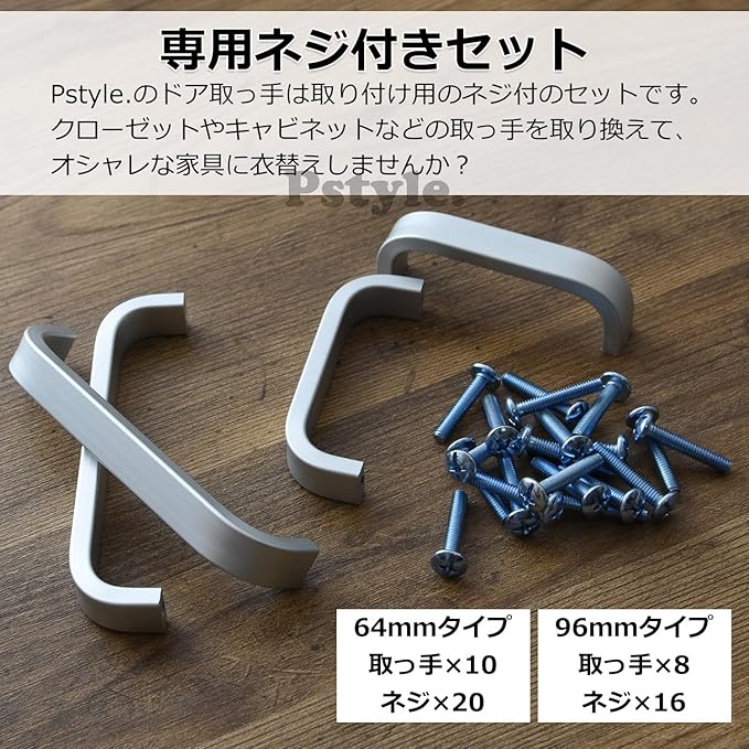 【取手とネジがセットに】 Pstyle.のドア取っ手は、取り付け用のネジ付きで8個セットになっております。クローゼットやキャビネットなどのとってを取り替えてオシャレな家具に衣替えしませんか?