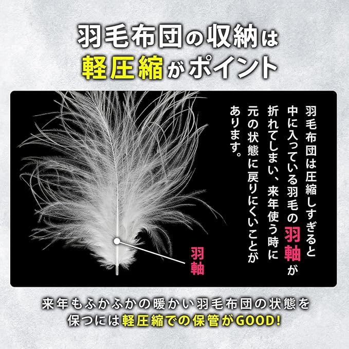 ●圧縮しないので羽毛を傷めにくく、ふかふか感や暖かさを次のシーズンまでキープ。