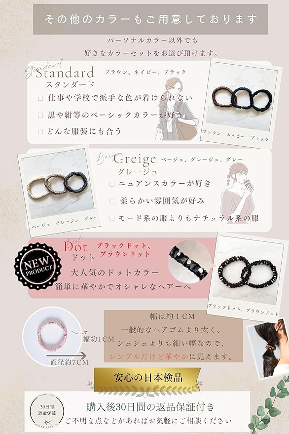 ✅【パーソナルカラーで似合う色が簡単に見つかる♪】パーソナルカラー毎に選べるセットをご用意しました。肌や髪に最適な似合う色合いを簡単に見つけることができます。さらに、パーソナルカラーに限らず、ベーシックやベージュなど人気のカラーバリエーションも豊富に揃えました。お気に入りの色を見つけて、その日の気分や個性に合わせてヘアセットを楽しんでください。自分色で彩られたシルクシュシュが、あなたの魅力を際立たせます♪