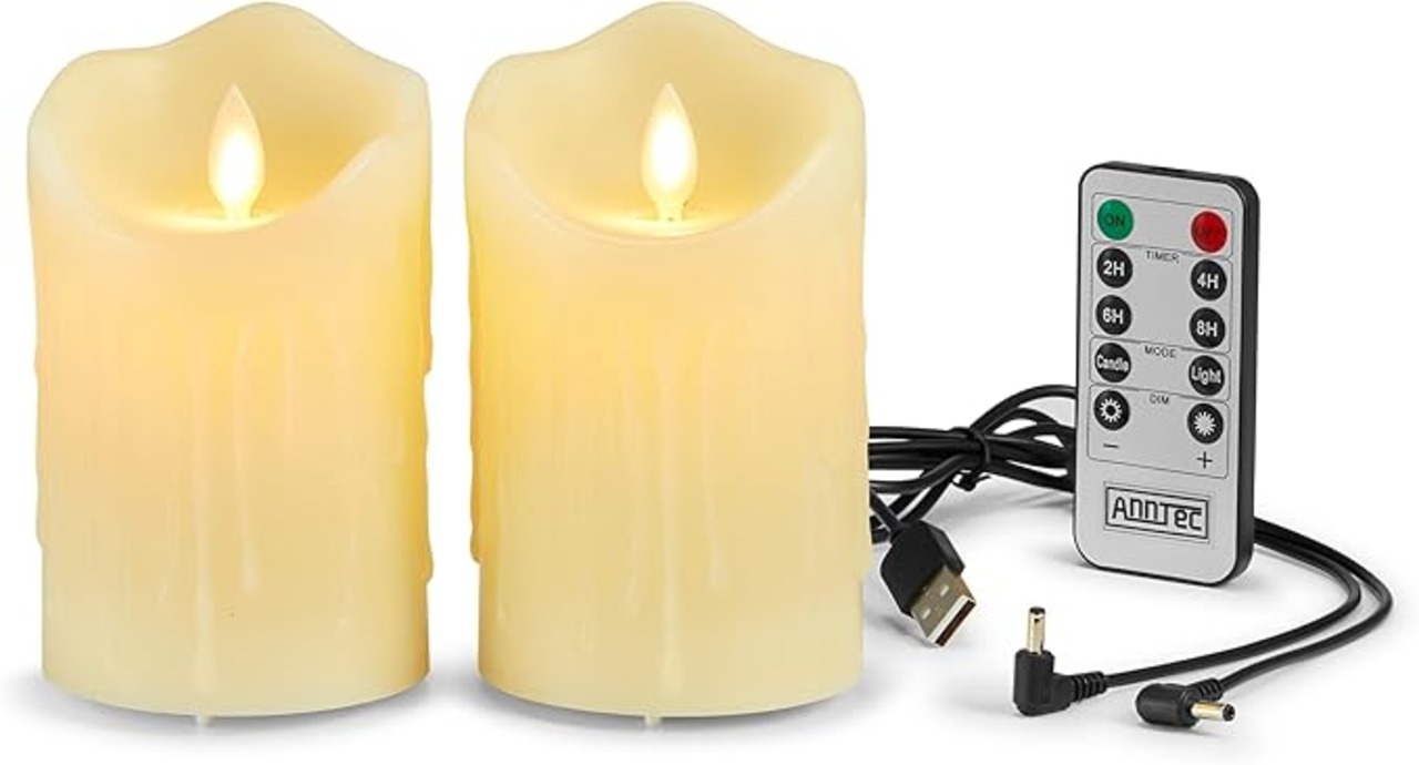 AnnTec LEDキャンドルライト 【2点セット】 ledキャンドル キャンドルライト ろうそく led USB充電式 ロウソク 暖色光 専用リモコン付 自動消灯タイマー 本物の炎のようにゆらめく 火を使わない ゆらゆら揺れる 安全 省エネ (直径7.5cm 高さ15cm)