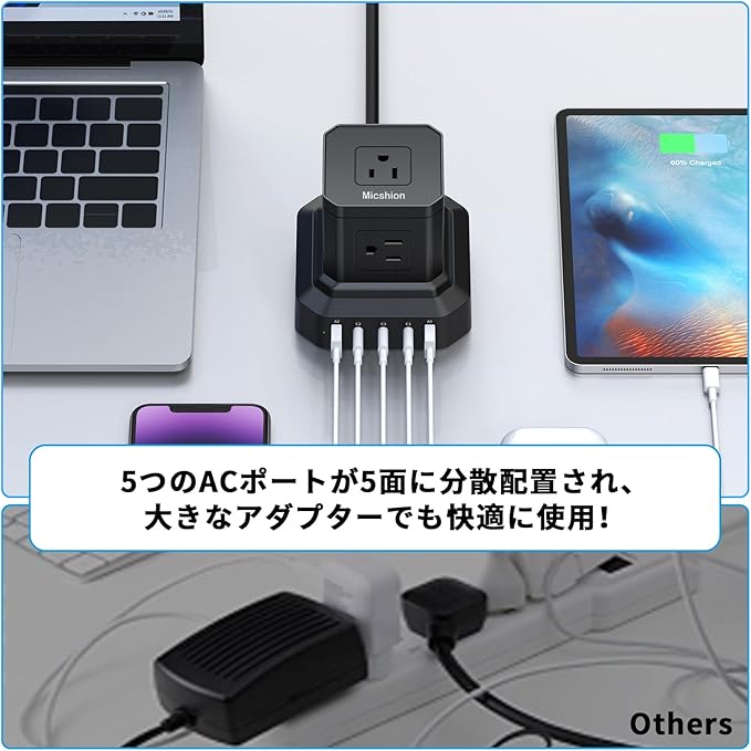 Micshion PD65W機能付電源タップ 3個USB-Cポート 2個USB-Aポート 5個AC口(100-240V) 延長コード2M コンセントusb付き(合計2400W)雷ガード/アース機能付き タコ足配線 干渉せず テーブルタップ マルチタップ たこあしコンセント 安全保護 自宅用 会社用 ブラック