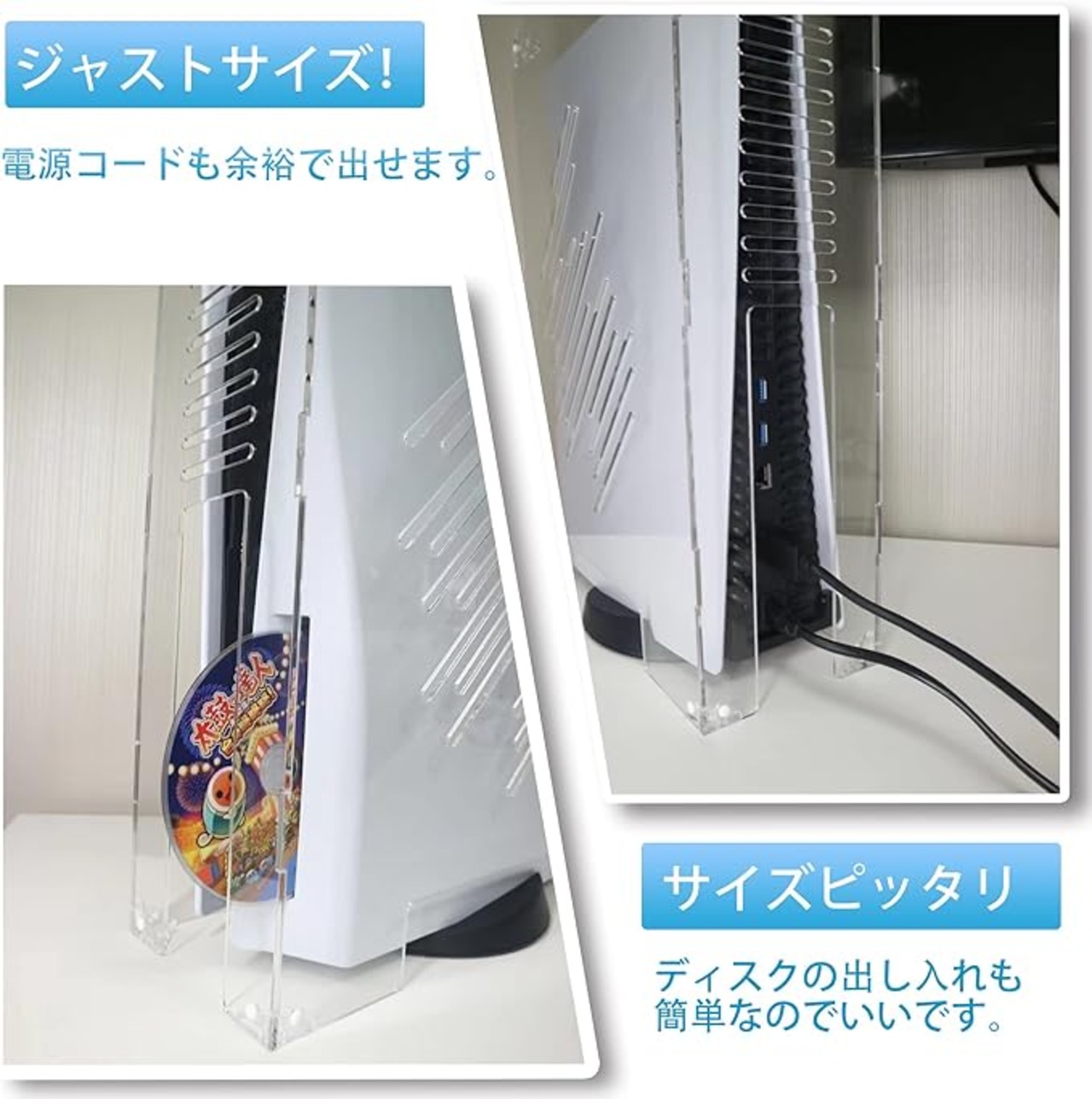⭐【サイズがピッタリ】アクリルカバー自体大きさには余裕ある為使い勝手は良いです。ディスク用のスリットやUSB端子用の穴もあるので、いちいち外さなくてもよいです。ps5スタンド使用していても特に問題なく使用できます!