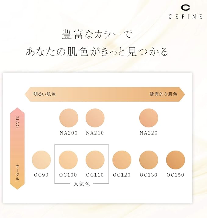 特徴 うるおいを守る, オイルコントロール, カバー力, フィット, 美容液成分配合, 肌のキメを整える, 肌を明るくする, 自然な仕上がり, 色落ちにくい, 色補正