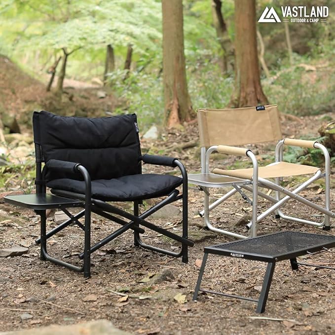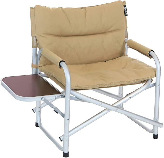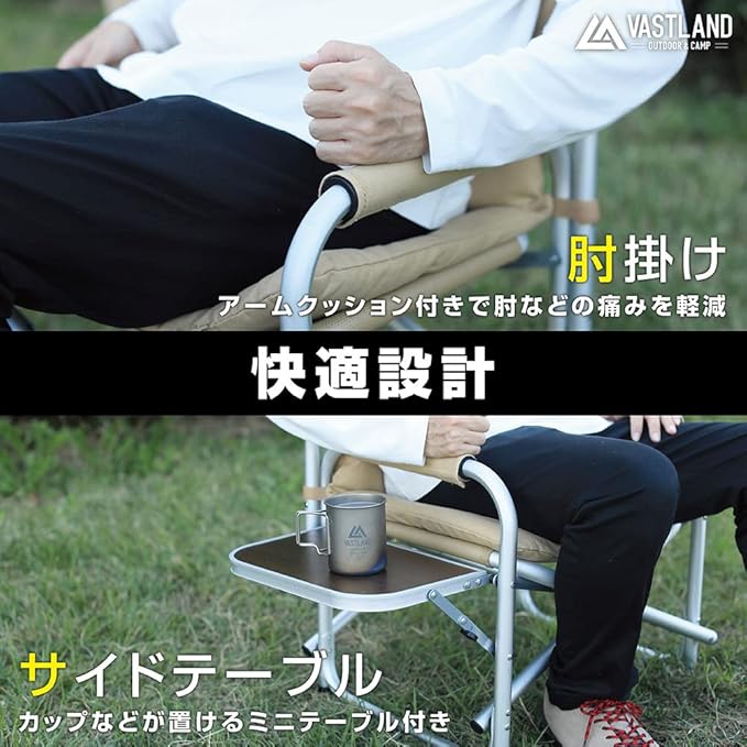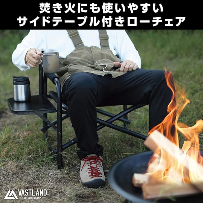 キャンプやアウトドアシーンに便利なサイドテーブル付き「ディレクターズチェア」です。ゆったり焚き火を眺めることができるロータイプです