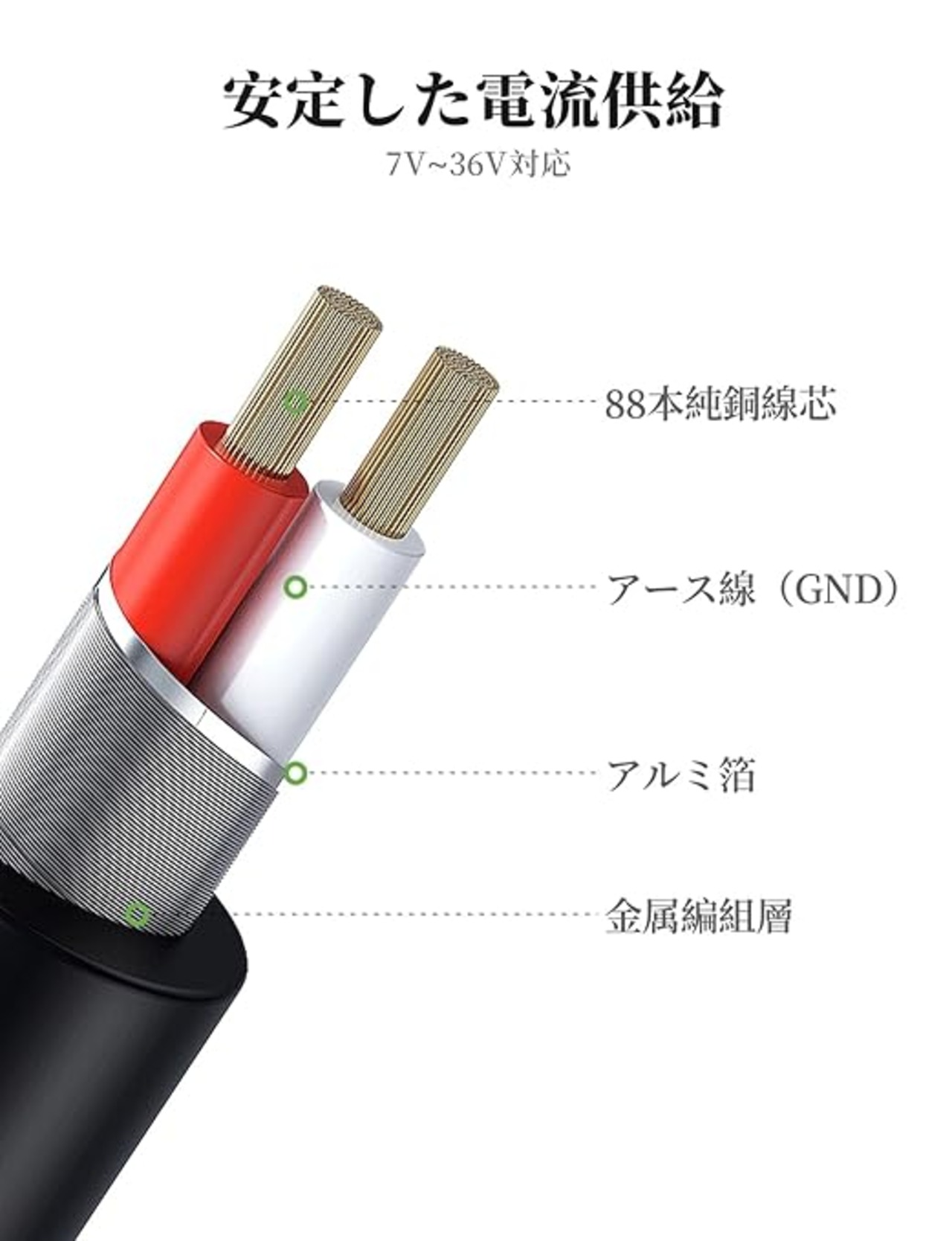 【精密な構造・安心の作り】内部は88本の純銅線芯に加え、アース線(GND)、アルミ箔、金属編組層など多層構造で、ノイズを抑えつつ安全・安定した電流供給をサポートします。7V~36Vまで幅広く対応。