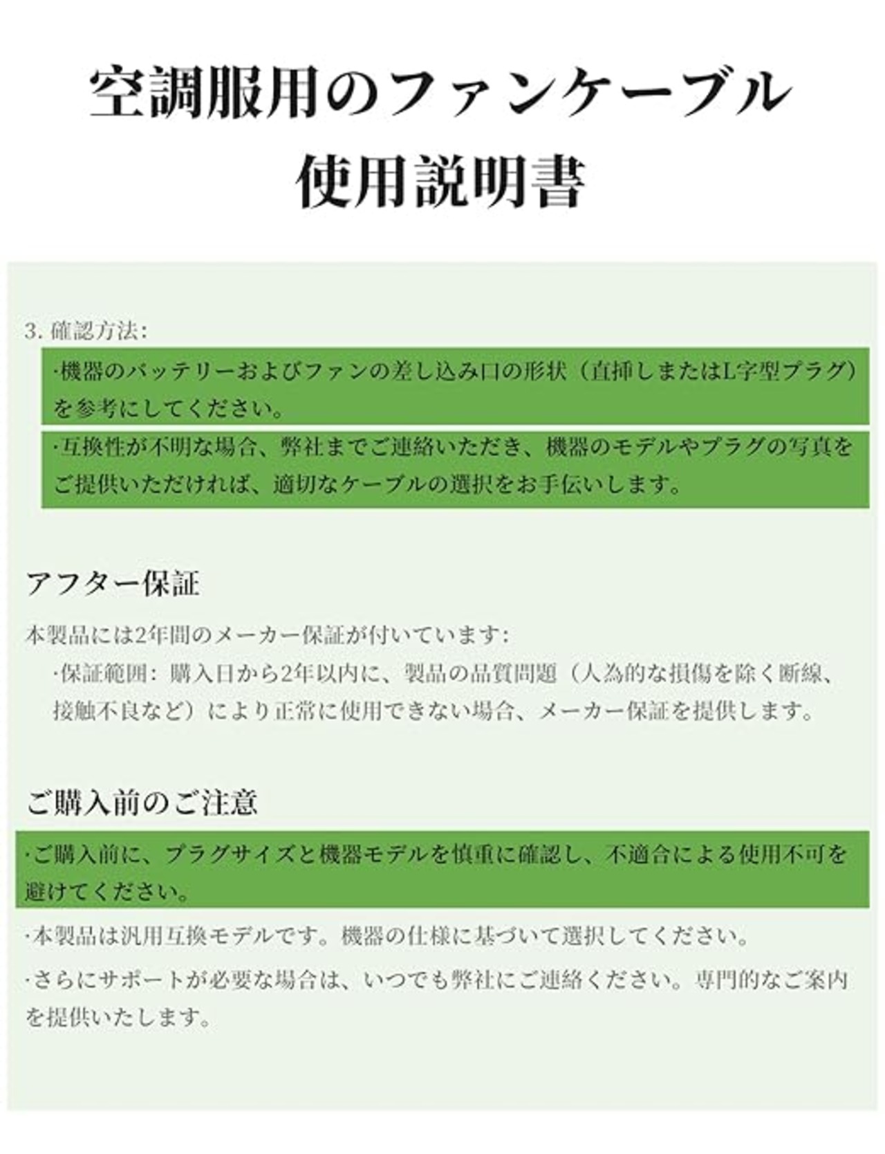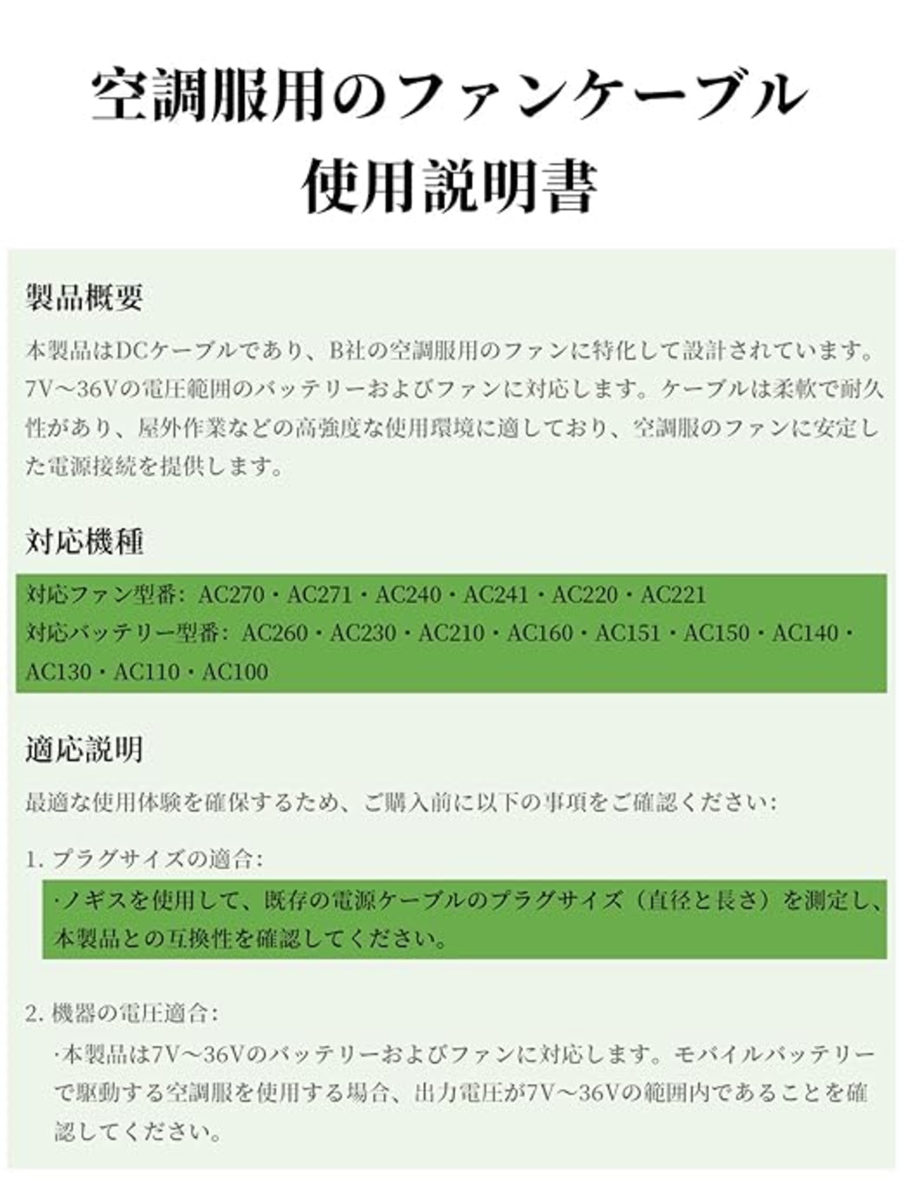 【幅広い互換性・安心設計】本製品はBURTLEバートルケーブルと互換性があり、対応ファン型番:AC270、AC271、AC240、AC241、AC220、AC221、対応バッテリー型番:AC260、AC230、AC210、AC140、AC130、AC100、AC160に適合します。ご注意:本ケーブルはBURTLE純正品ではありません。