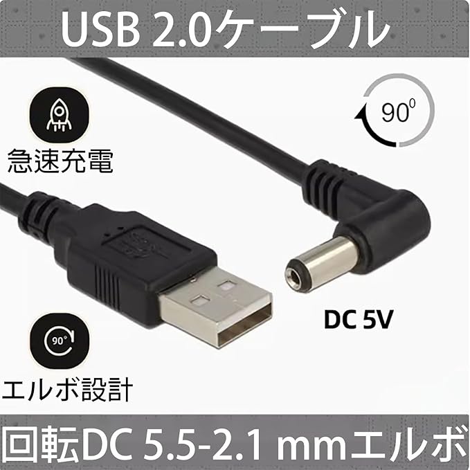 USBからDC側に5 V最大2 Aの電気を供給できるケーブル。