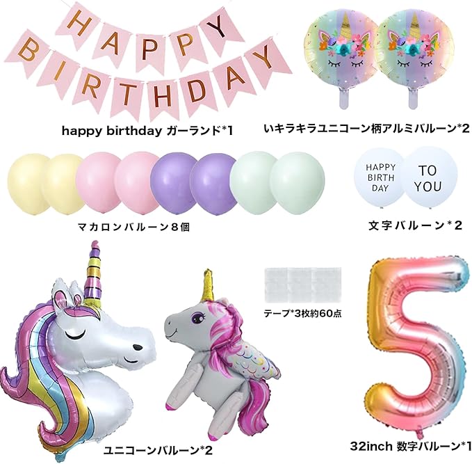 仕様: happy birthday ガーランドx1(ピンク) 単旗サイズ 約20cmx16cm 子供サイズBIGユニコーンx1(約110cmx77cm) 足つきユニコーンx1(約56cmx50cm) 可愛いキラキラユニコーン柄アルミバルーンx2(45cmx45cm) マカロンバルーン8個(ピンク、ホワイト、パープル、グリーン各2枚) HAPPY BIRTHDAY付きホワイトバルーンx2 レインボー数字バルーン1個付き(約80cm) 付属品:ストロー、バルーンテープ3枚(60点)