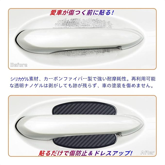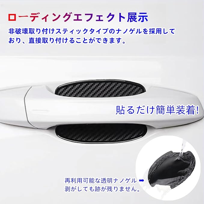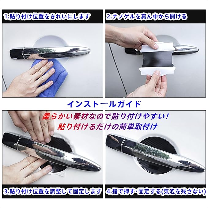 【取り付け簡単】まず、布で車の表面のホコリを丁寧に取り除きます。 念のため、ドライヤーなどで温めてから貼り付けてください。 結合強度が高まるはずです。 あとはドアハンドルの切り込みに沿って柔軟に接着していきます。