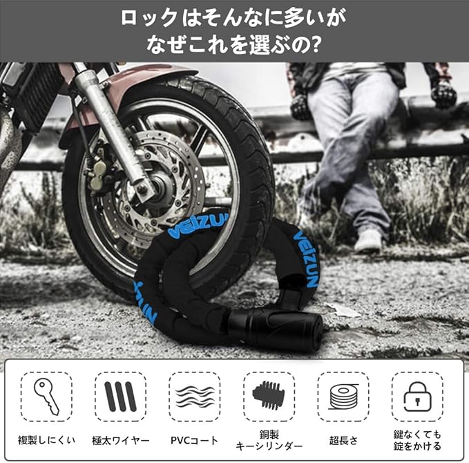 VEIZUN バイクロック チェーンロック ワイヤーロック バイク 自転車 スチールロック タイヤロック φ(直径)22mm 1200mm 盗難防止 多用途 頑丈 極太 極厚 ブラック