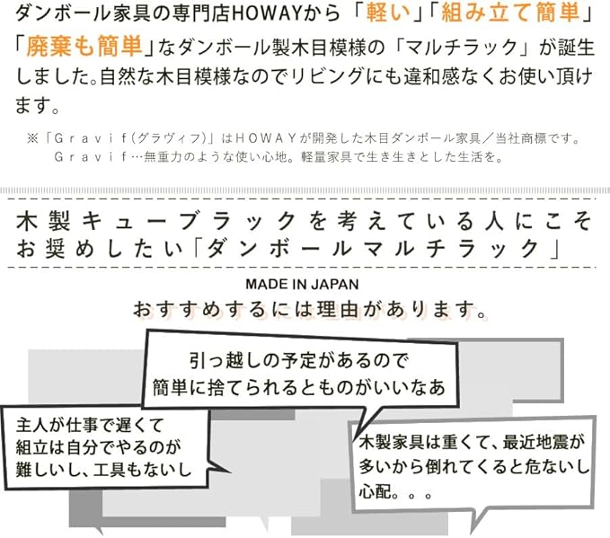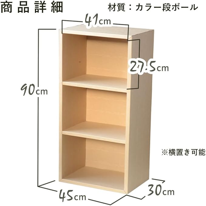 地震対策に!超軽量棚で安心!安全!3段それぞれの高さが約27.5cmです。 段ボール&強度設計の棚ですので、全棚に本や文具を並べても壊れることはありません。 複数使用して、自由な棚をカスタマイズできます。 ・組み立ても簡単です。(約20分) ※個人差もありますが、1人で組み立てた時の作業時間です。 「組み立て動画」と「組立説明書」に目を通してから作業するとスムーズです。 ・素材は段ボールを使用していますが段ボールとは思えない様な見た目です。 ・軽いので移動が楽チンです。 ・処分が簡単です。 ・段ボールは再利用が可能なのでとってもエコです。 ・地震の時に倒れてきても大きな怪我になりにくいので安心です。
