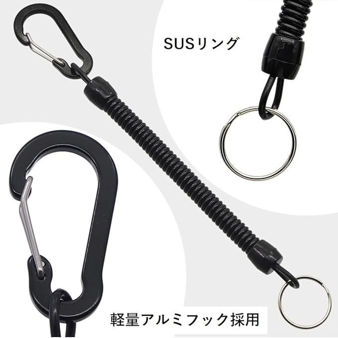 材質:カラビナはアルミ製 カールコードストラップはTPU材質,カニカン:亜鉛合金 チェイン+リング:鉄, 優れたTPU材質を使用しているため、断線や劣化防止に強い、長期間使用できます.何度も引いても回復スピードには問題ありません.