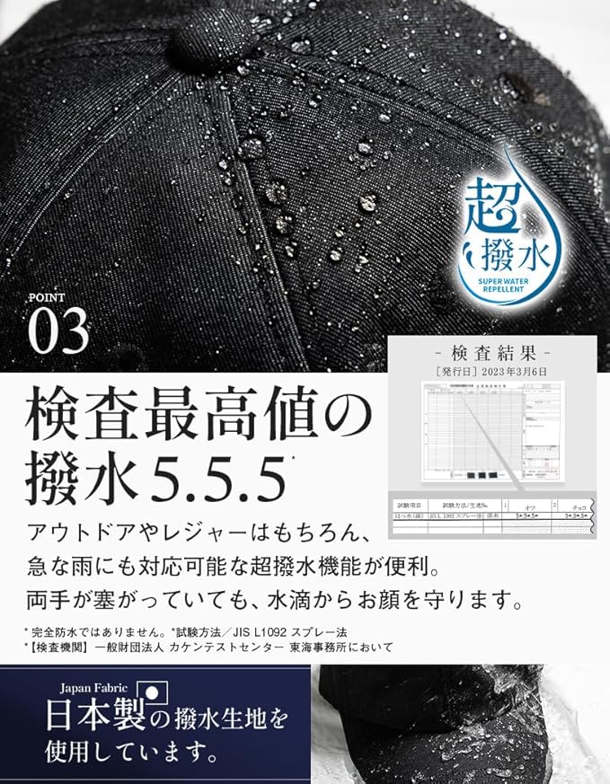 【高撥水】撥水加工を施しているので急な雨も安心!高い撥水力で雨の日はもちろん、海や川などアウトドアでも活躍してくれます。