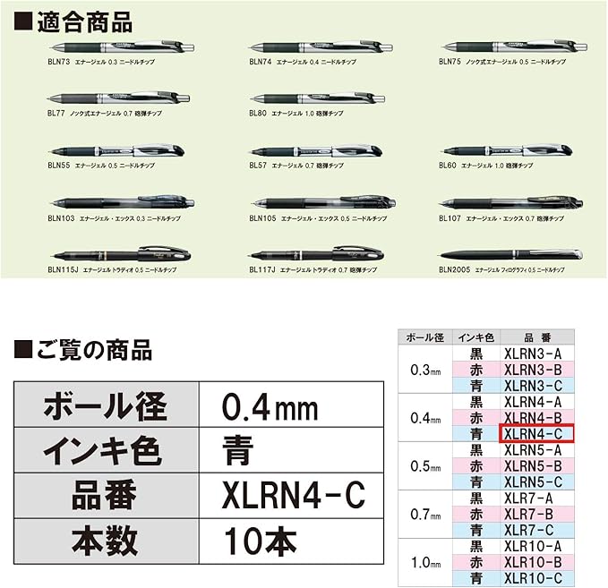 ぺんてる ボールペン替芯 エナージェル 0.4mm XLRN4-C 青 10本