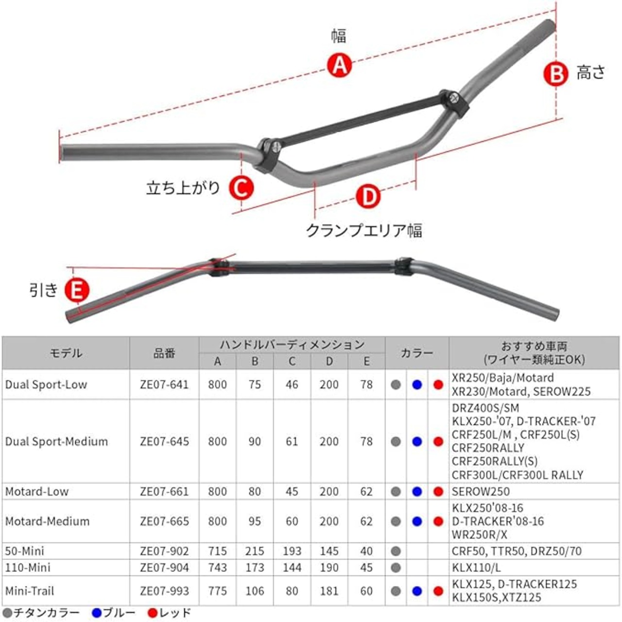 ジータレーシング(ZETA RACING) KLX250'08-16, D-TRACKER'08-16, WR250R/X等 COMPハンドルバー Motard-Medium スタンダード径(22.2mm) 汎用 幅:800mm 高さ:95mm 引き:62mm バーエンドキャップ付属 ブルー F4388