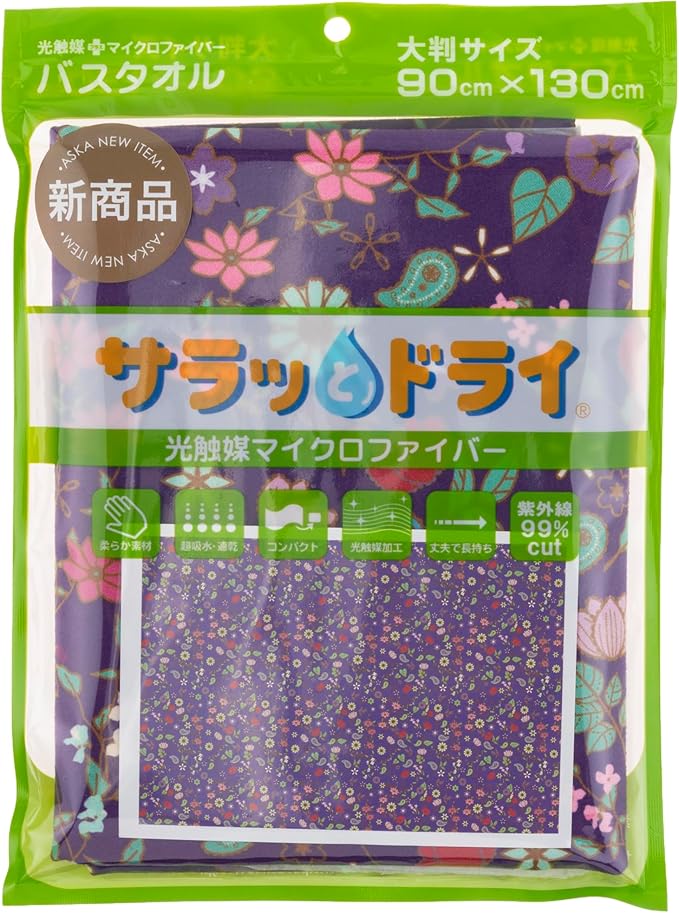 小学校高学年から大人まで使える、90x130㎝の大判サイズとなっております。両面違う柄になっており、リバーシブルでもお使いいただけます。「サラッとドライ」は吸水性、速乾性が綿タオルの約3倍。バスタオルを体に巻いているだけで、お体の水分を残さず素早く吸い取ります。冬場のお風呂上りも水分を残さず吸い取るので、湯冷めして風邪をひく心配も減ります。柔らか素材で赤ちゃんでも安心して使えるので、出産祝いにも人気です。もちろん髪の毛の水分の素早く吸い取りますので、サラッとドライを使用していただいている美容室も多数あります。