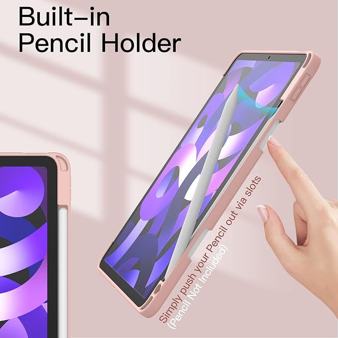 JETech iPad Air 11 インチ M3/M2 (2025/2024)、iPad Air 5/4 ケース 10.9 インチ (第5/4世代、2022/2020モデル用) Pencil収納可能透明バックカバー 薄型 スタンド 衝撃吸収 タブレットカバー オートウェイク/スリープ機能 (ローズゴールド)