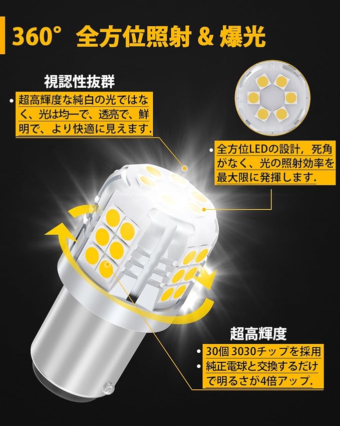 【超高輝度&長寿命】超高輝度1200LMの明るさ低電力消耗、最先端超高発光効率の3030LED素子30個搭載、360 全方位照射でき、12V車用S25 ダブル バルブ。原装ランプより4倍に明るいです. 6000K-6500K純白の光です. 省エネ、しかないです. 長持ちで、運行時間は50000時間以上です. 起動時、遅延の状況がないです。