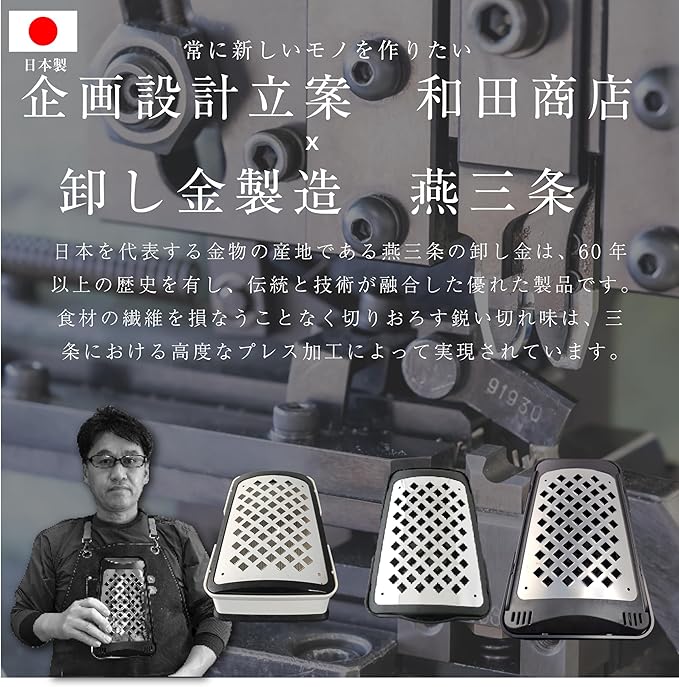 卸し金部分はステンレス製。新潟三条製。水切り受け皿、エラストマーゴム滑り止め