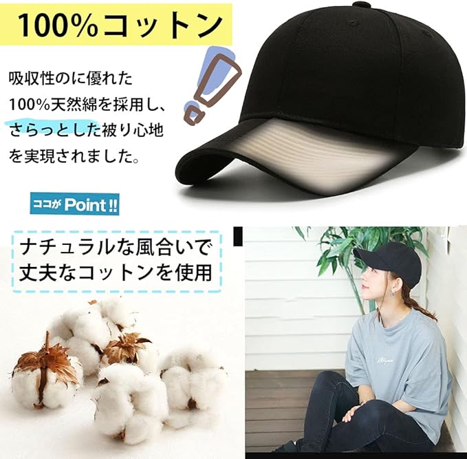 【100%コットン キャップ】綿100%素材のキャップ:こだわり抜いた素材と洗練された品質 無地でシンプルなデザインなので 色んなスタイルの服装にマッチするキャップです。ぜひ手にとって違いを体感してみてください。デザインはシンプルでスポーツやレジャーにぴったり。