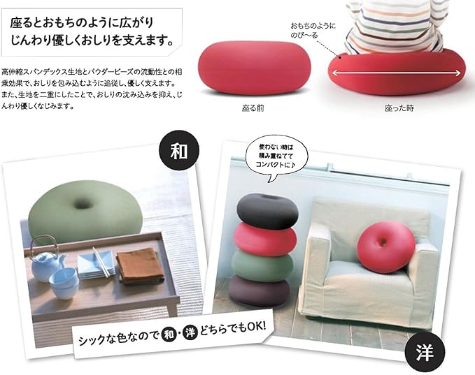 くつろぎタイムに;ふんわりドーナツ状でしっかりした作りのクッションは、リビングでのリラックスタイムにぴったりです。