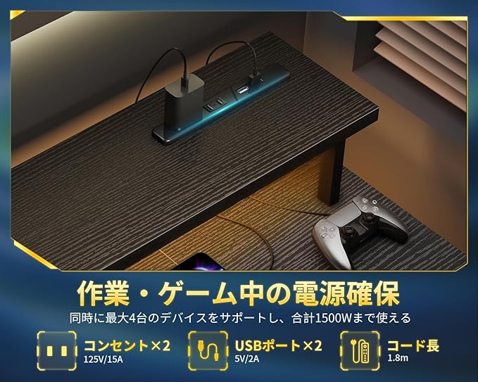 【コンセント付き、作業しながらの電源確保】デスクにはコンセント2口+USBポート2口が付いている。同時に最大4台のデバイスをサポートし、合計1500Wまで使える。手近なところで電源が取れ、スマホやタブレットなどの充電が便利になり、電池残量を気にせずに長時間の作業が可能。