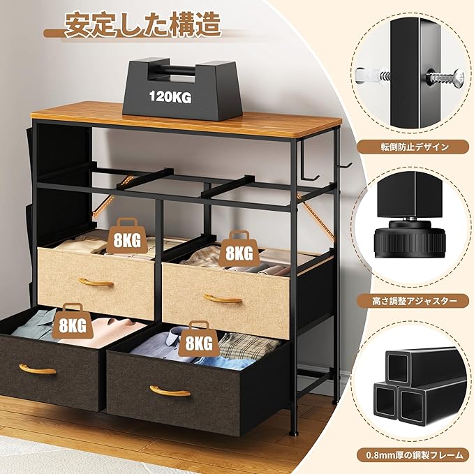 【こだわった構造 安定感強い】REIBIIタンスは、15 0.8mmの鋼製フレームとE1基準の12mm木板を採用し、全体で120kgまで耐えられる頑丈な構造です。各引き出しは中間部と底部にMDF板を採用しており、大引き出しは8kg、小引き出しは5kgまで変形せずに収納可能。長く年数も使えます。さらに、安定性を高めるX字補強と床に優しいアジャスターを装備。多少の凹凸がある床でもぐらつきません。転倒防止金具も標準装備で安心です。床までは10cmのすき間を確保しているので、ロボット掃除機も楽々入り、掃除に便利です。