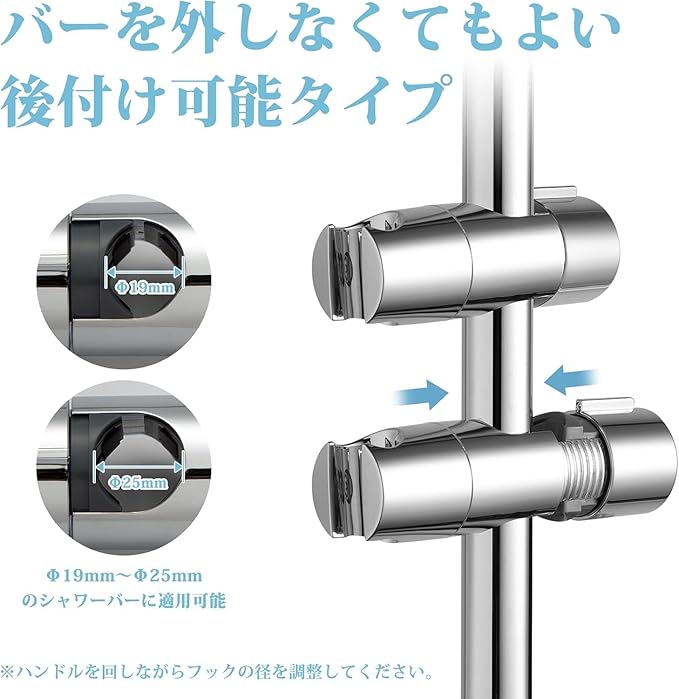 [後付けタイプ] 本品はバーを外しなくても取付できる後付けタイプです。ハンドルを軽く回して固定部をバーに合わせて設置できます。直径19mm~25mmのスライドバーに適用します。ご注文の前はスライドバーの直径をご確認ください。(直径の測定方法:スライドバーの直径=(スライドバー)周囲/π)。