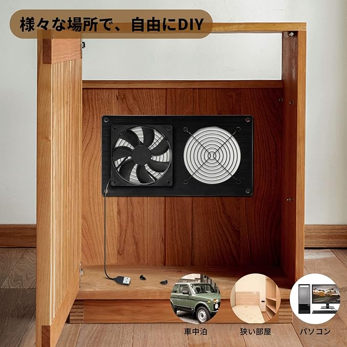 幅広い使用範囲:車中泊、電気棚、狭い部屋など様々な場所の小型換気ファンとし使用されています。