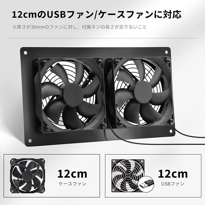 対応可能なファン:殆どの12cmUSBファン、12cmケースファンに対応可能です。※ファンのネジ穴同士の距離が一致すれば、取付可能です。