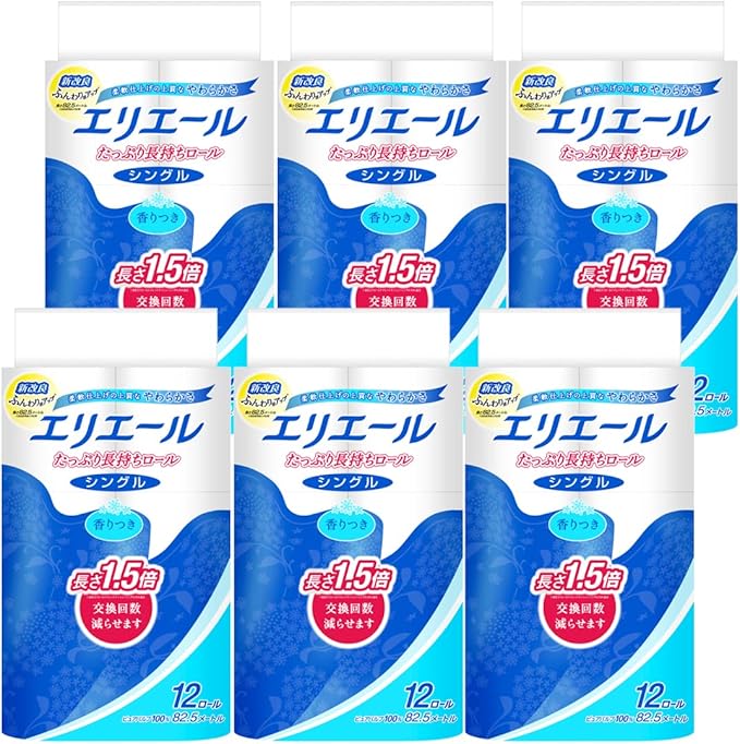 エリエール トイレットペーパー たっぷり長持ち 82.5m 72ロール(12ロール 6パック) シングル パルプ100% リラックス感のある香り【ケース販売】