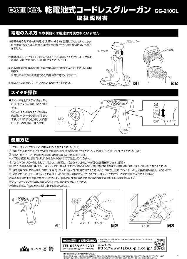 高儀(Takagi) EARTH MAN 乾電池式 コードレスグルーガン GG-210CL グル―スティックセット