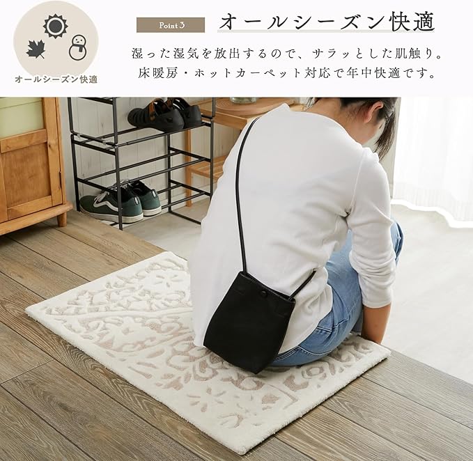 【ウール100%】ウールは他の繊維に比べて汚れにくいのが特徴です。また、静電気が発生しにくいので、ホコリがつきにくく、遊び毛による自浄作用があるため、毎日の簡単なお手入れでいつも綺麗にお使いいただけます。他の素材に比べて吸湿性が高い天然素材は、吸った湿気を放出し、1年を通してムレにくく、サラッとした肌触りを楽しめます。静電気も起こりにくく、乾燥する季節でも使うことができます。そんな天然素材を立体的な幾何学デザインで、贅沢に仕様したラグとなっています。