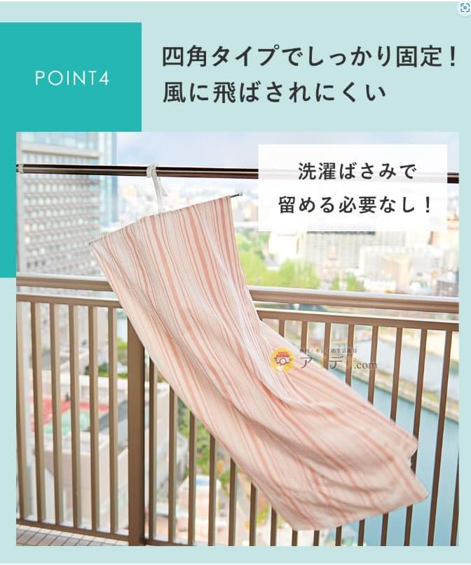 くるくる通すだけでシーツやバスタオルが省スペースで干せる。四角タイプで風が吹いても飛びにくい。カーテン・ベッドカバーにも