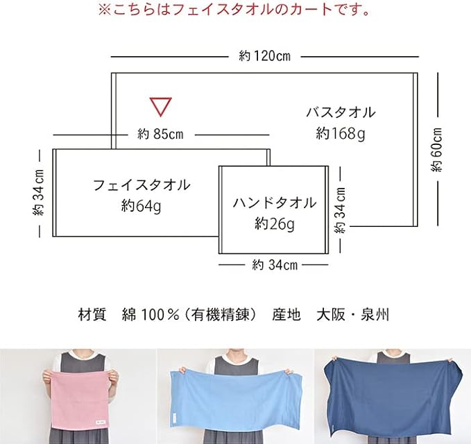 【泉州産ガーゼタオル】フェイスタオル 約34cm 85cm、重さ:約64g、素材:綿100%